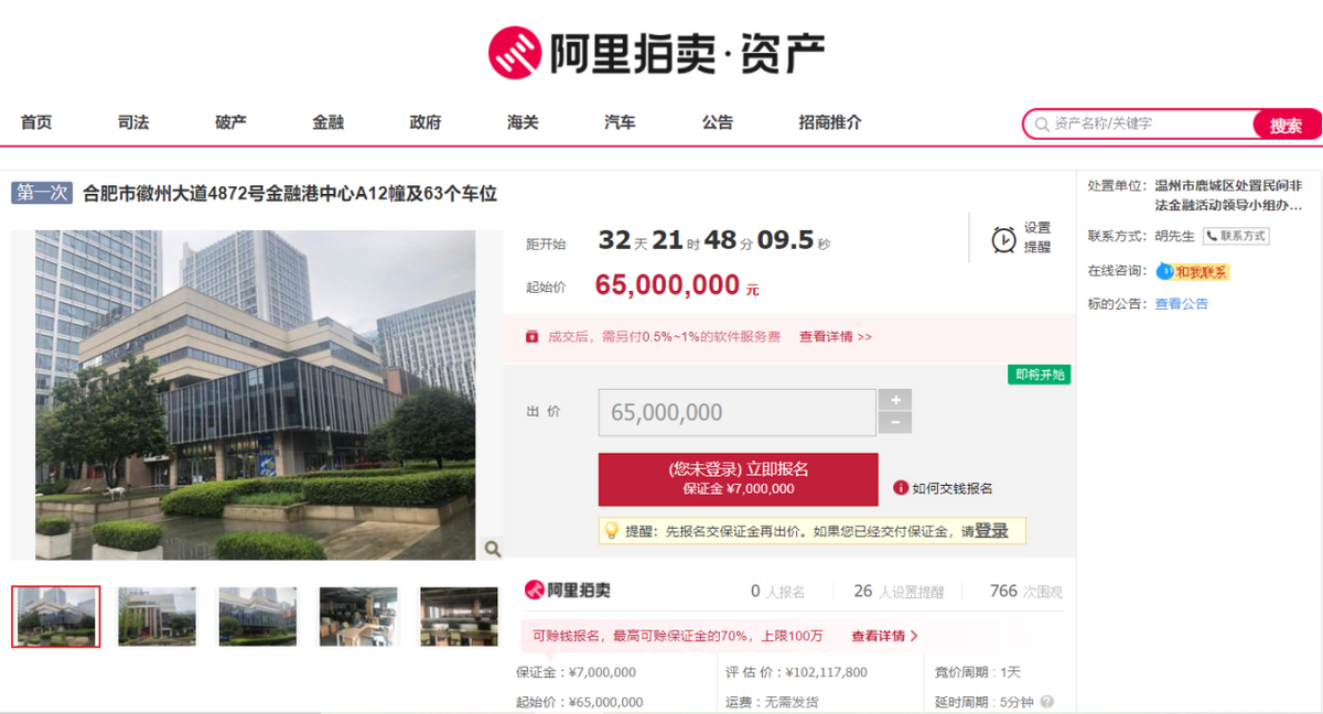 标的商业大厦,位于安徽省合肥市滨湖区徽州大道4872号金融港中心A12幢商101-105、办101-103、办201-501室、地下车库一期63个车位,属于商业用房,建筑面积10306.59㎡,附近有安徽合肥公共资源交易中心、招商银行、上海浦东发展银行、合肥师范附小(二小)、滨湖国际会展中心二期、世纪金源购物中心等公共服务设施,生活便利,人流量大。标的以6.5折起拍,起拍价6500万元,低于评估价近3700万元,保证金700万元,加价幅度10万元。