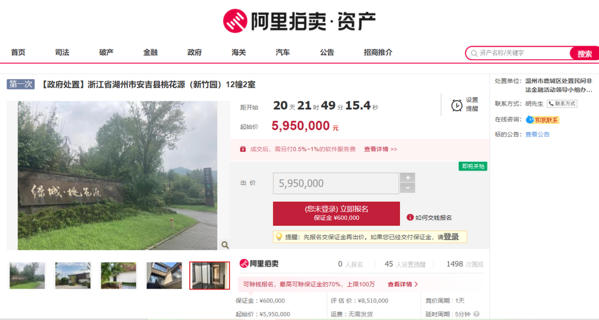 标的别墅,位于浙江省湖州市安吉县桃花源(新竹园)12幢2室,为精装修江南风情中式院落,地处安吉灵峰度假区内核,依山就势,融于山林草木间,由于三面采光,外立面和空间感受上都十分通透轻盈,被称为“树梢上的玻璃盒子”,并获得设计专利。标的为新房,三居室二厅三卫,总层数2层,面积为201.97㎡,7折起拍,起拍价595万余元,低于评估价250万余元,保证金60万元,加价幅度1万元。