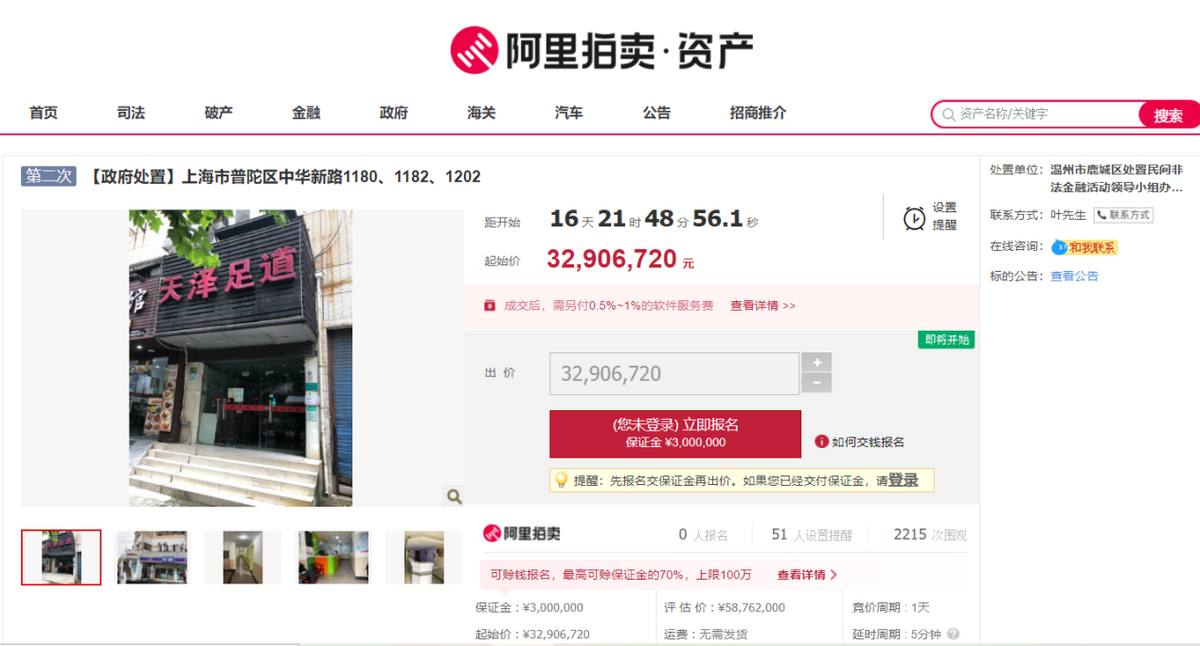 标的临街商铺,位于上海市普陀区中华新路1180号、1182号、1202号,均位于2层,整幢大楼总高24层,竣工于1997年,钢混结构,1-2层均为商铺,3层及以上均为住宅。商铺所在位置属于上海中心城区西北部,是沪宁发展轴线的起点,也是上海连接长三角及内地的重要陆上门户和交通枢纽,距虹桥综合交通枢纽10千米,距浦东机场50千米,沪宁城际铁与地铁11号线、15号线和规划21号线在上海西站综合交通枢纽实现“零换乘”,形成区域综合立体交通。区域内以住宅社区为主,商办设施有家乐福、艾尚商务酒店、链家、平江农贸市场等各业态的沿街店铺,整体客流量较多。标的面积为3025.96㎡,5.6折起拍(二拍),起拍价3290万余元,低于评估价2580万余元,保证金300万元,加价幅度5万元。