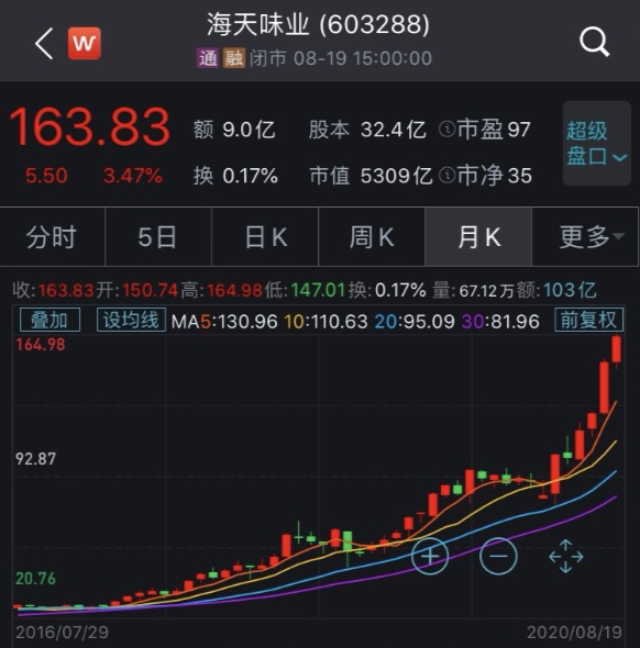 8月19日,海天味业股价再创历史新高,市值破5300亿元,今年以来,海天味业股价涨幅达到84%,三年内股价涨幅达400%!