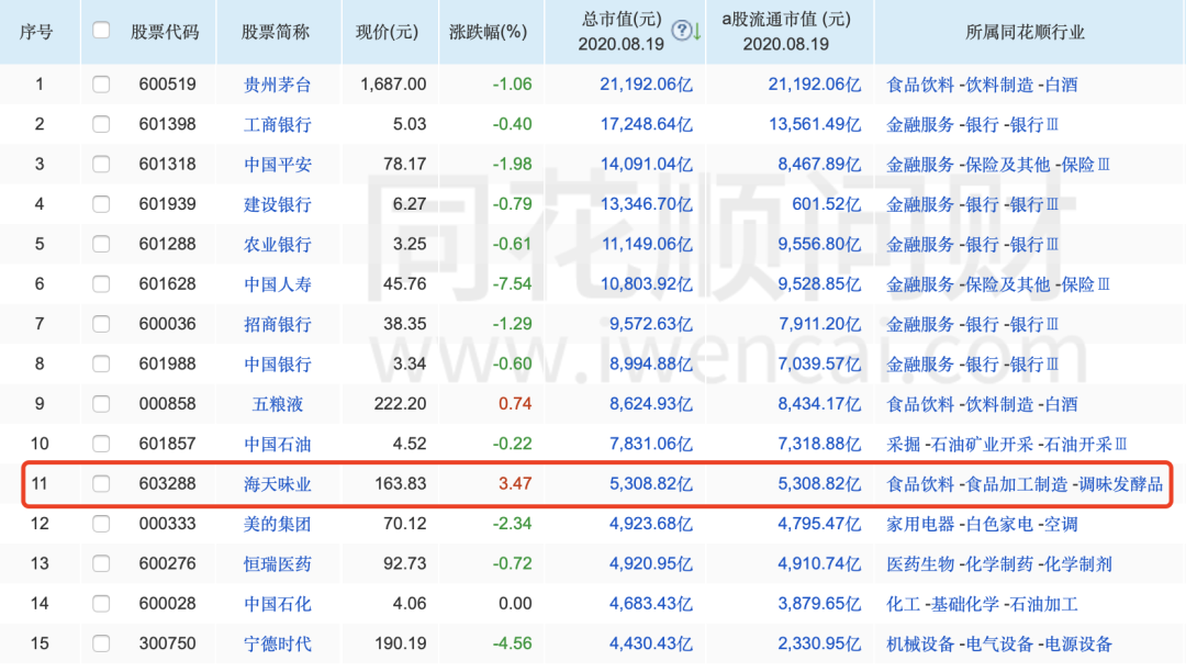 从A股所有上市公司的市值排名来看,海天味业排名第十一,前十名中除国有五大行以外,贵州茅台以2.13万亿的市值排名首位、中国平安、中国人寿、五粮液分别排名第三、第六、第九。