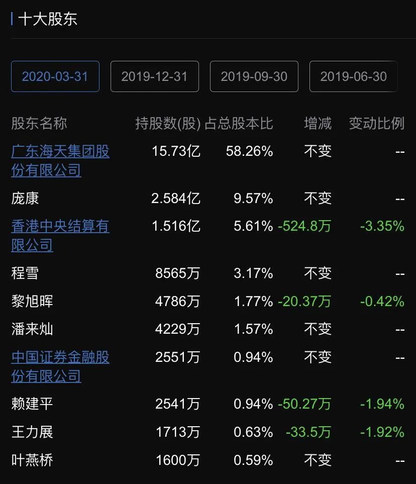 筹码高度集中也是海天味业的一大特征。公司前十大股东中,庞康、程雪、潘来灿、赖建平、王力展等也是海天味业第一大股东海天集团的股东。截至2020年一季报,海天味业前十大股东合计持有上市公司股份达到了83%。