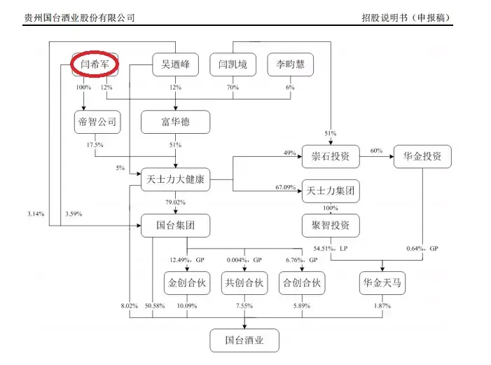 贵州国台酒业招股书显示,闫希军、吴迺峰、闫凯境和李畇慧为发行人的实际控制人。这四人通过直接持股及控制的富华德、帝智公司合计控制天士力大健康 73.50%股权,通过直接持股及天士力大健康合计控制国台集团 85.75%股权;