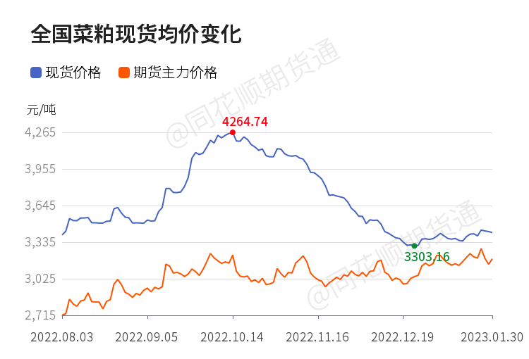 1月30日全国菜粕现货均价现货价格报价3415.79元/吨,相较于期货主力价格(3194.00元/吨)升水221.79元/吨。